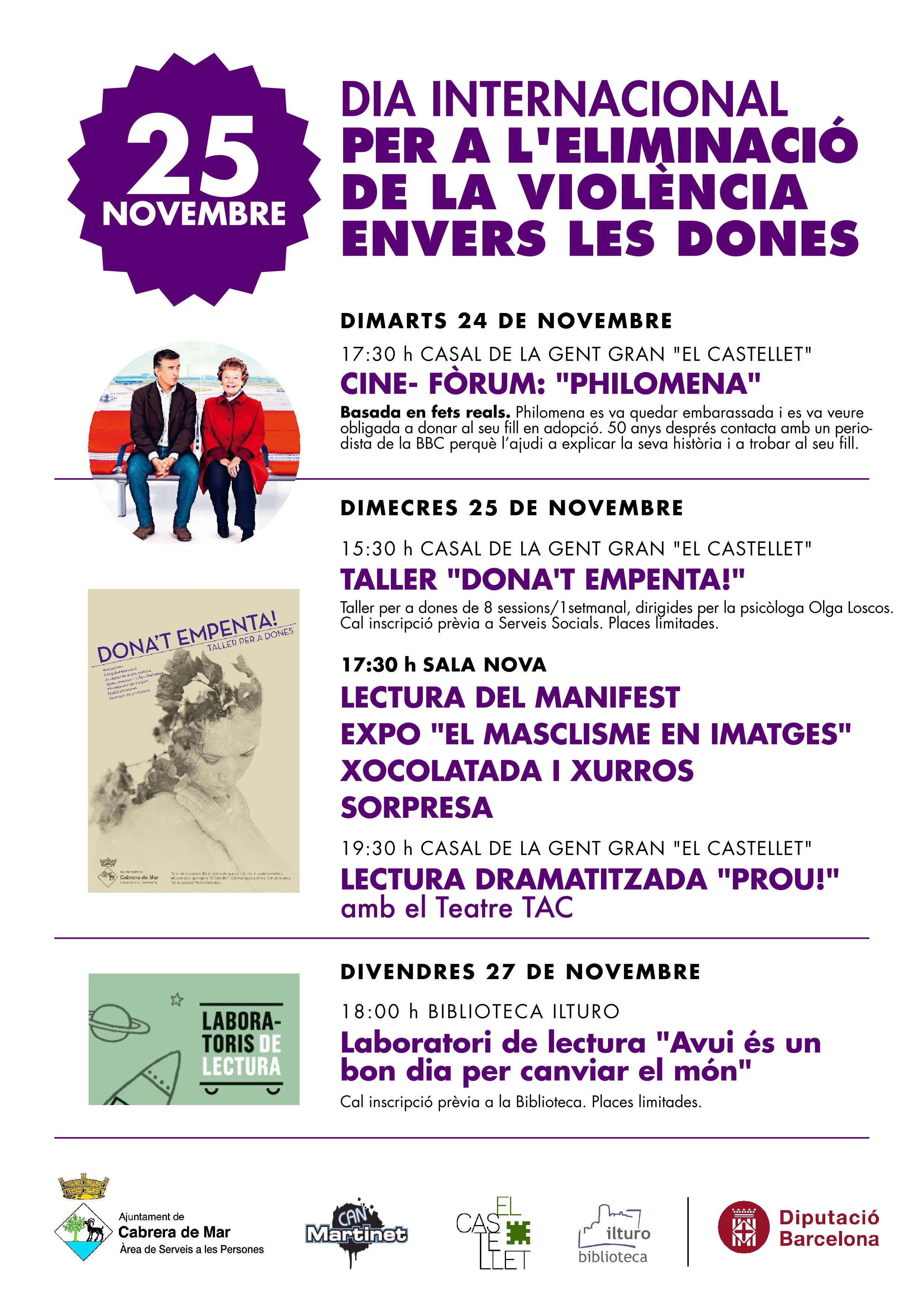 Cada any, ajuntament i entitats del Maresme preparen actes i activitats per commemorar el Dia Internacional contra la Violència envers les dones. Es tracta de programes cada cop més variats i adaptats a diferents tipus de públic diana: joves, dones, professionals, … i de format diferent: tallers, cursos, jornades, gimcanes, exposicions, etc.
