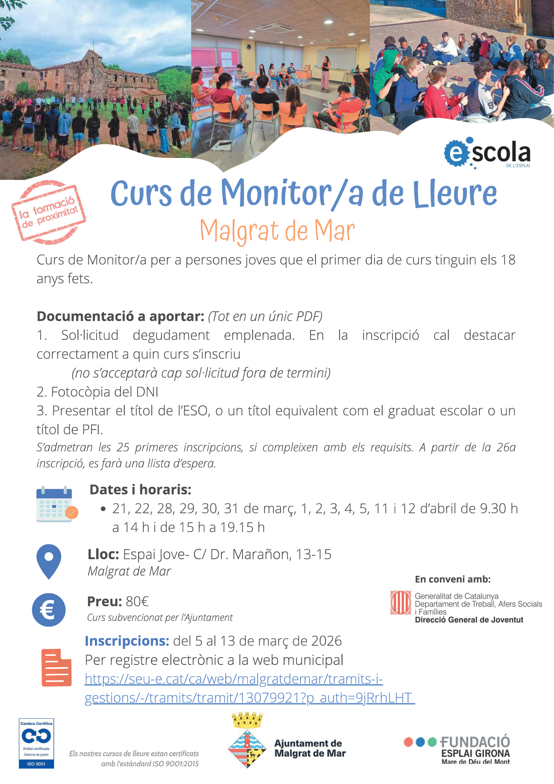 Les inscripcions del tràmit es poden fer a partir del pròxim dijous 5 de març i fins al dia 13 a la pàgina web de l’Ajuntament. Cal enviar una sol·licitud, (per registre electrònic a: https://seu-e.cat/ca/web/malgratdemar/tramits-i-gestions/-/tramits/tramit/13079921?p_auth=9jRrhLHT  heu d’adjuntar una fotocòpia del DNI i presentar el títol d’ESO o un títol equivalent com el Graduat Escolar o bé un títol de Programació de Formació i Inserció.