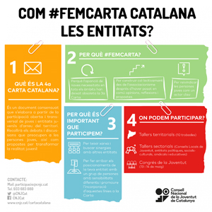 Si voleu prendre part en tot aquest procés i participar en la construcció de la 4a Carta Catalana de la Joventut, consulteu des d’aquesta web totes les fases del procés i valoreu en quina us podeu implicar!