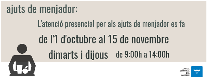 Des d”avui, 1 d’octubre, el Consell Comarcal del Maresme atendrà presencialment les famílies que vulgin fer consultes sobre els ajuts de menjador escolar. L’horari, fins el 15 de novembre serà els dimarts i dijous de 9:00h a 14:00h a les instal·lacions de la Plaça Miqulel Biada, 1 de Mataró.