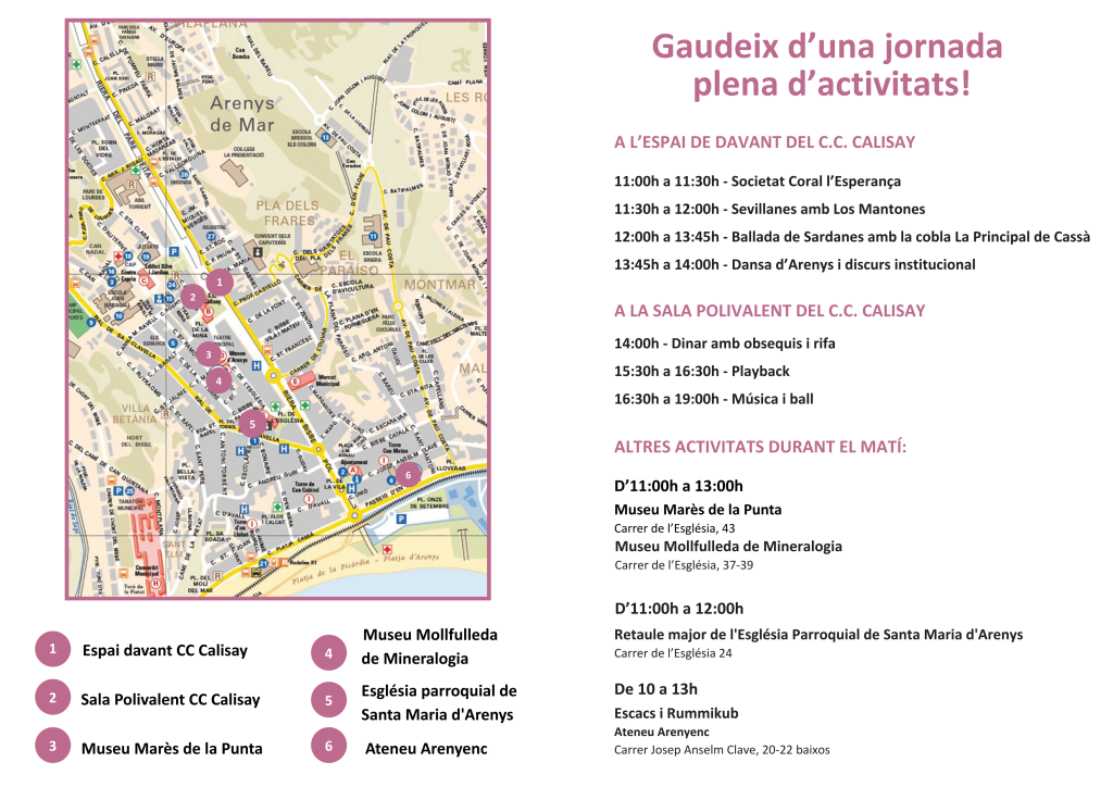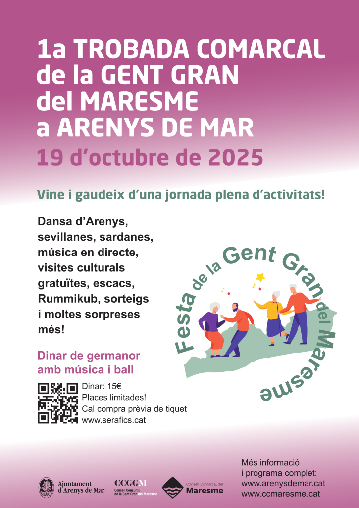 La jornada inclou una àmplia oferta d’activitats culturals, lúdiques i socials que tindran com a espai central un dinar de germanor amenitzat amb música i ball que es farà al Calisay. Serà un espai per compartir experiències, retrobar amistats i crear nous vincles entre persones grans de diferents municipis del Maresme. Aquesta és la única activitat que tindrà un cost. Els tiquets valen 15 euros i es poden comprar online a través del web www.serafics.cat o presencialment a la regidoria de la Gent Gran d’Arenys de Mar, ubicada al Calisay, durant els matins. Les places són limitades a 250 persones.