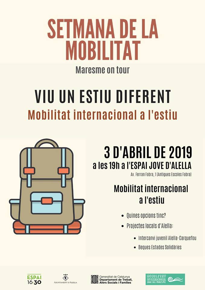 El proper 3 d’abril a a les 19h dins de la Setmana de la Mobilitat organitzades per l’Ajuntament de Teià, El Masnou i Alella es farà una xerrada sobre mobilitat internacional a l’estiu a l’Espai Jove d’Alella En aquesta també es parlarà dels projectes que tenen en marxa com és l’intercanvi juvenil Alella-Carquefou i les Beques sobre Estades Solidàries. Cal inscripció prèvia. A més, podreu vistar durant tota la setmana l’Exposició “Reptes. Joves del Mareme en els règims de mobilitat” |
